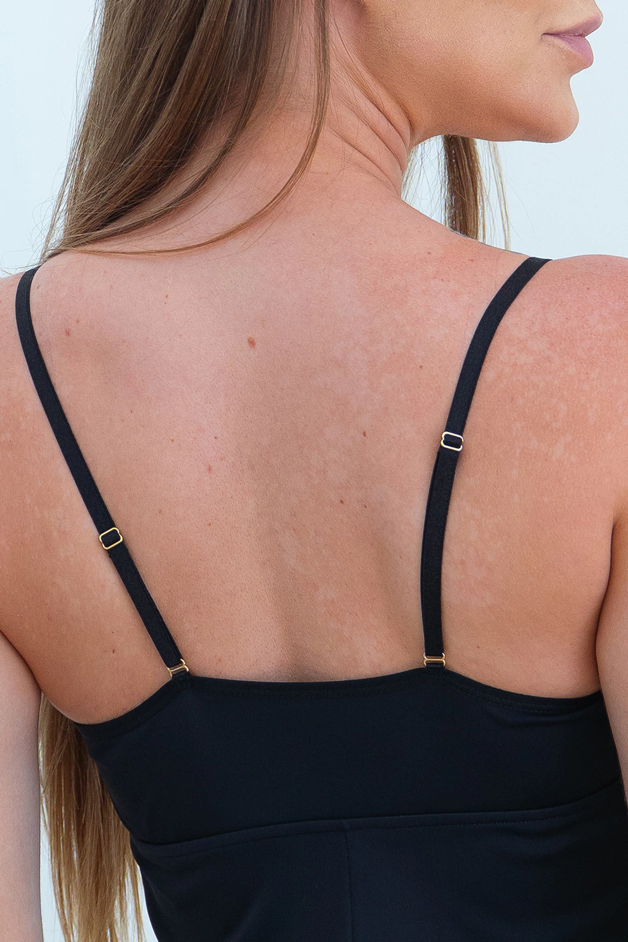 Alças finas reguláveis: ajuste preciso para manter o decote no ponto certo.