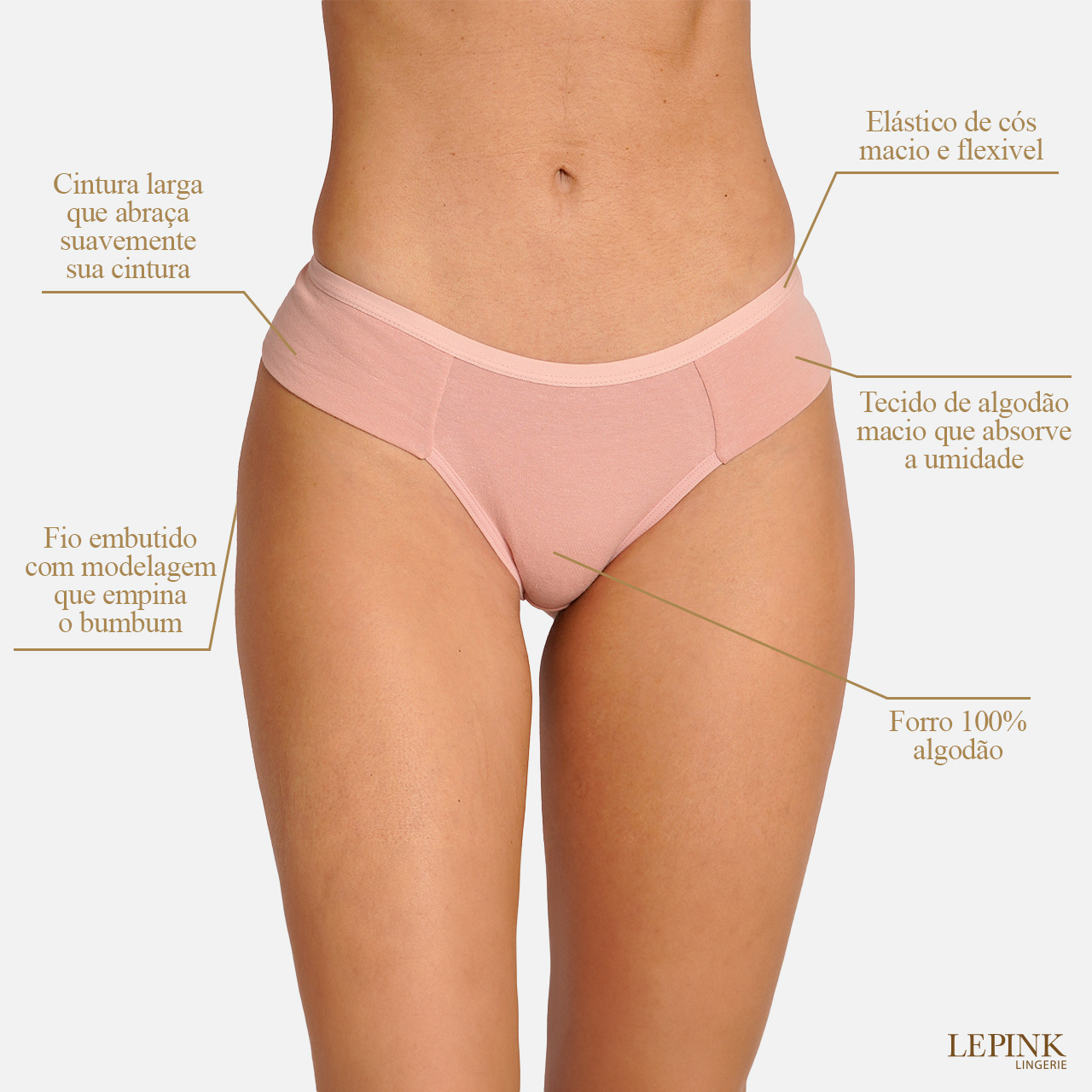 O cós é bonito e prático: com elástico macio e flexível, não aperta nem se desloca, garantindo firmeza e conforto mesmo nos dias mais movimentados.